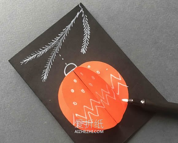 +- 首页 贺卡 正文 卡纸做一个圣诞球,手工制作圣诞贺卡的方法图解。思路很简单,先将橘色卡纸切成圆形,粘贴到黑色卡片上,再用记号笔画出图案即可。按照下面的说明,只需不多的步骤就可以将这个圣诞贺卡做出来。如果你感兴趣,不妨跟着教程尝试一下! 1.拿出两张橘色卡纸,对折后画一条曲线。 2.剪出两个圆片。如图粘贴到黑色卡片上。 3.用白色记号笔画出顶部。 4.再用记号笔画树枝。 5.在圣诞球上画一些圆圈和折线。这个圣诞贺卡就制作完成了! 贺卡灯笼礼物生日新年圣诞节情人节母亲节父亲节端午节教师节中秋节国庆节重阳节感恩节万圣节 爱折纸 收藏 分享 链接
